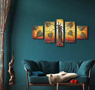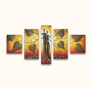 Handgeschilderd 5-Luik Schilderij Adam en Eva. Olieverfschilderij van hoge kwaliteit waarbij een man en een vrouw door middel van moderne paletmes schilderkunst zijn afgebeeld.
