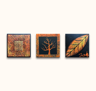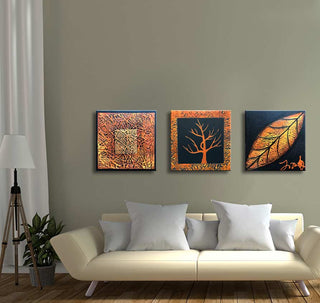 Handgeschilderd 3-Luik Schilderij Ancient Leafs. Olieverfschilderij van hoge kwaliteit waarbij bladstructuren door middel van moderne paletmes schilderkunst zijn afgebeeld.