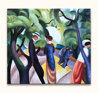 Handgeschilderd schilderij Promenade van August Macke. Olieverfschilderij van hoge kwaliteit waarbij vibrante kleuren door middel van moderne schilderkunst zijn afgebeeld.