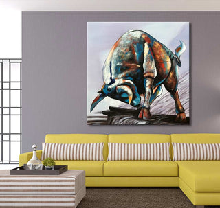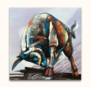 Handgeschilderd olieverfschilderij ‘Boze Stier’. Olieverfschilderij van hoge kwaliteit waarbij een stier, die bals gedrag vertoont door middel van impressionistische schilderkunst is afgebeeld.