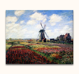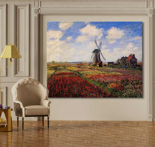 Handgeschilderd olieverfschilderij Molen in Bloemenveld van Claude Monet. Olieverfschilderij van hoge kwaliteit waarbij een molen in een bloemenveld door middel van impressionistische schilderkunst is afgebeeld.