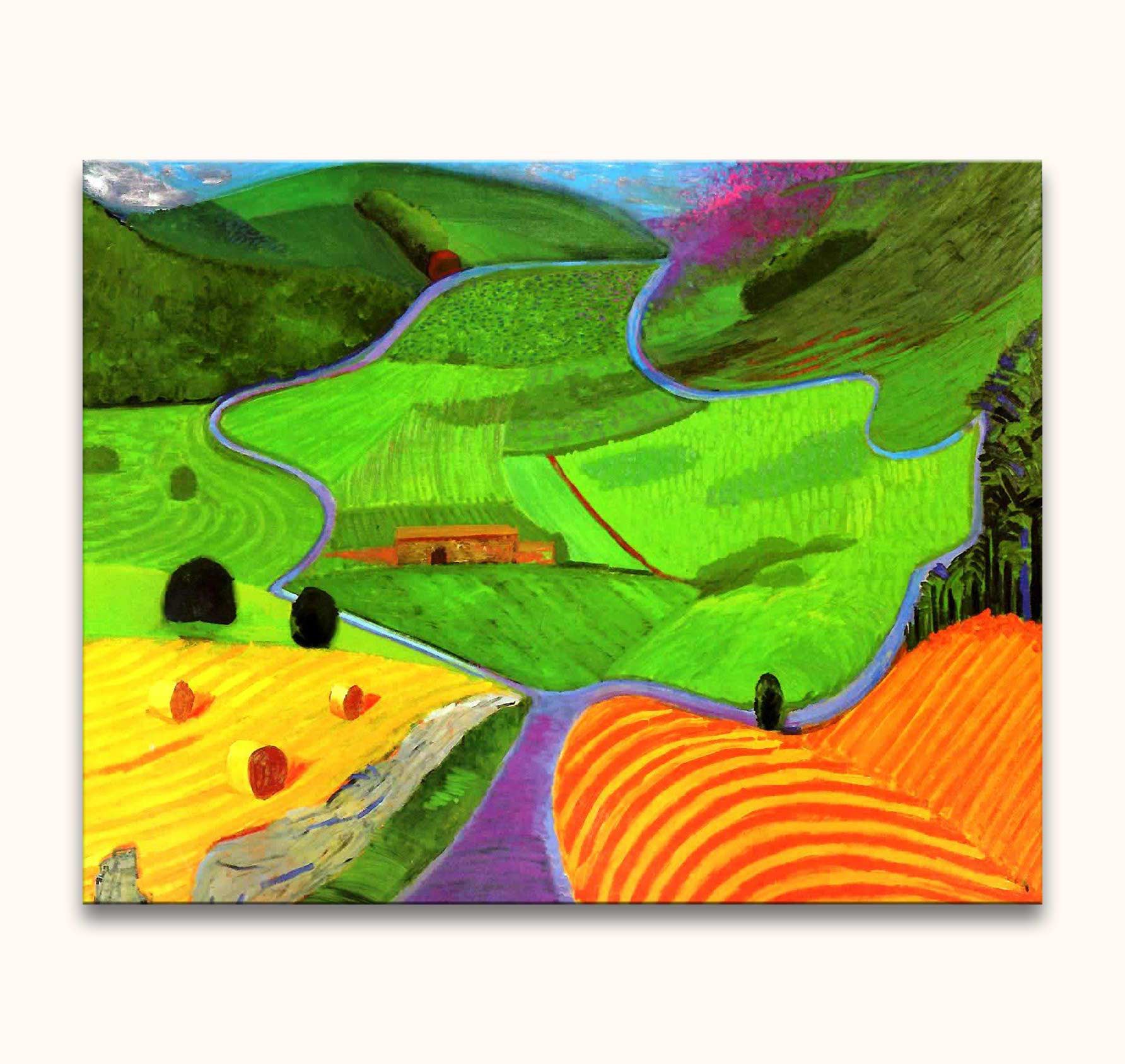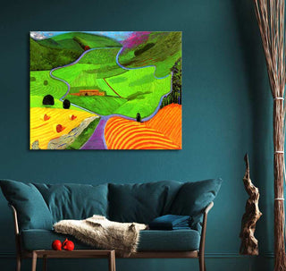 Handgeschilderd schilderij Garrowby Hill - David Hockney signature. Olieverfschilderij van hoge kwaliteit waarbij een heuvel landschap door middel van moderne schilderkunst is afgebeeld.