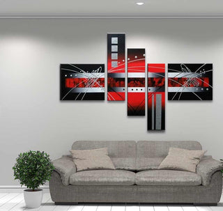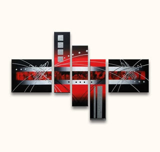 Handgeschilderd 5-Luik Schilderij Entangled Space. Olieverfschilderij van hoge kwaliteit waarbij moderne abstracte vormen door middel van paletmes schilderkunst zijn afgebeeld.