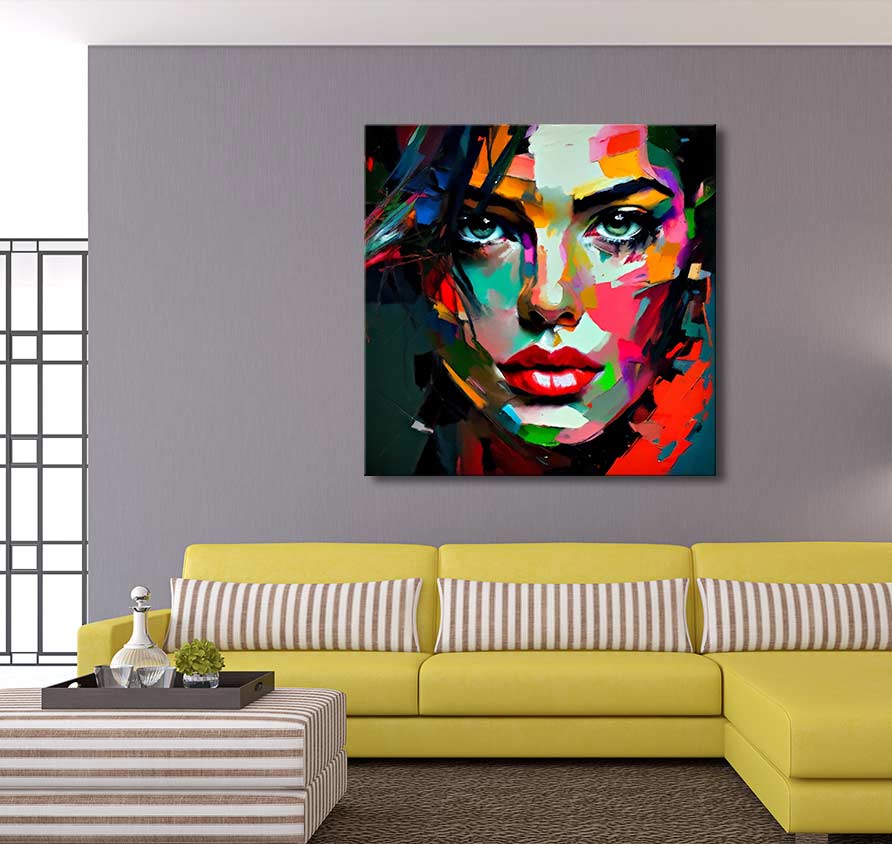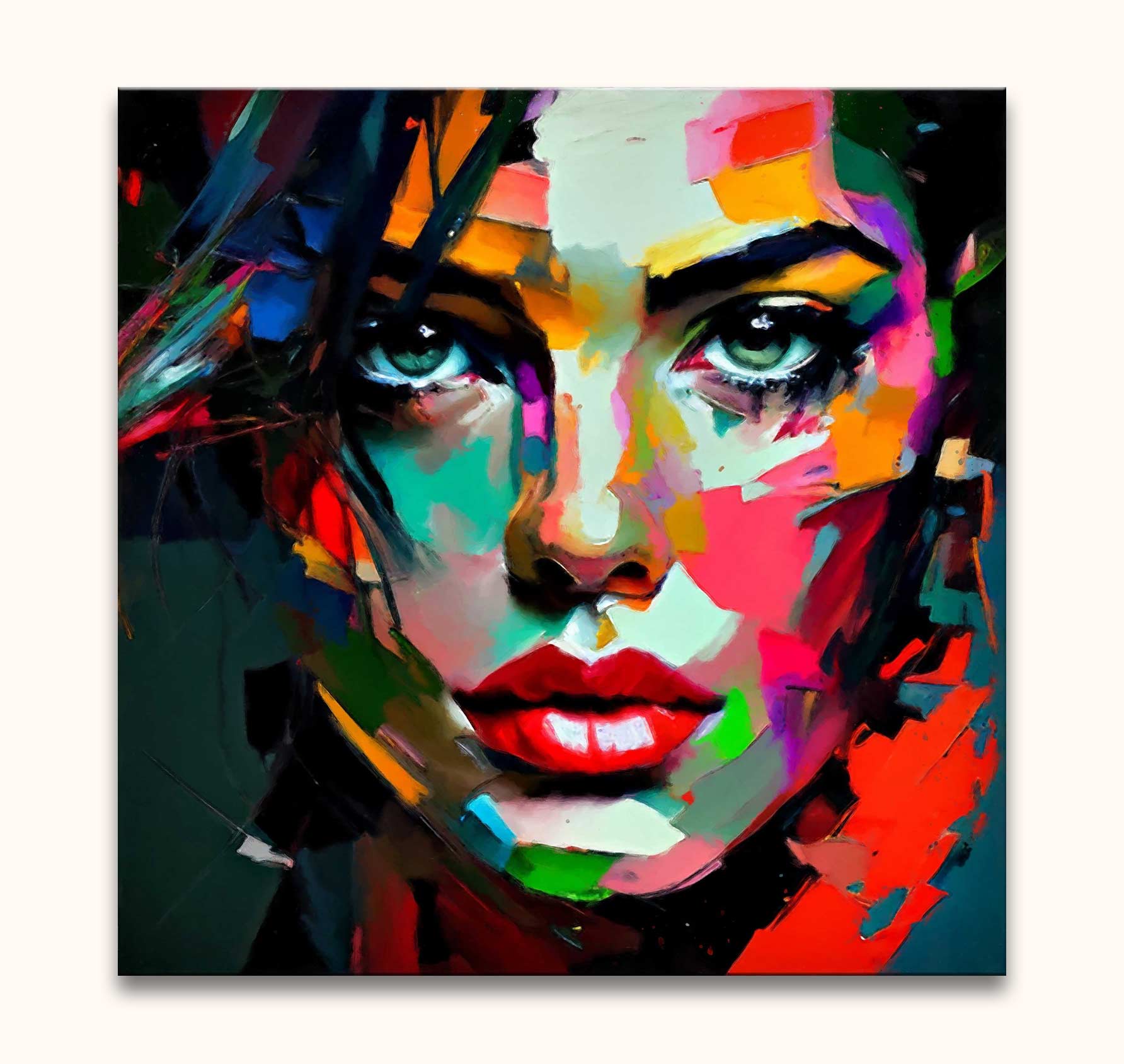 Handgeschilderd Pop Art schilderij 'Staring Lady' - Françoise Nielly-signature. Olieverfschilderij van hoge kwaliteit waarbij een vrouwengezicht door middel van moderne schilderkunst is afgebeeld.