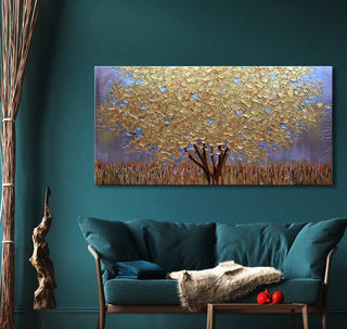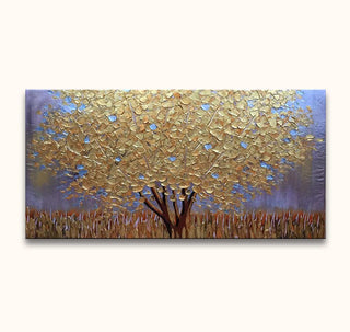 Handgeschilderd schilderij Gouden Esdoorn. Olieverfschilderij van hoge kwaliteit waarbij een gouden esdoorn in bloei door middel van moderne paletmes schilderkunst is afgebeeld.