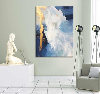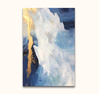 Handgeschilderd schilderij Gouden Waterval. Acrylverfschilderij van hoge kwaliteit waarbij een gouden acryl textuur op blauwe-witte kleurschakeringen door middel van moderne schilderkunst is afgebeeld.