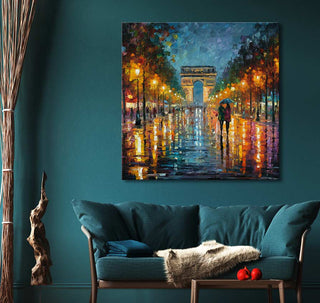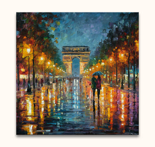 Origineel handgeschilderd schilderij 'Arc de Triomphe' in de stijl van Leonid Afremov, door Grootmeesters. Modern olieverfschilderij van hoge kwaliteit waarbij de unieke schoonheid van de Arc de Triomphe in Parijs door middel van impressionistische schilderkunst is afgebeeld. Dit is een origineel werk geïnspireerd door de stijl van Leonid Afremov, geen reproductie.