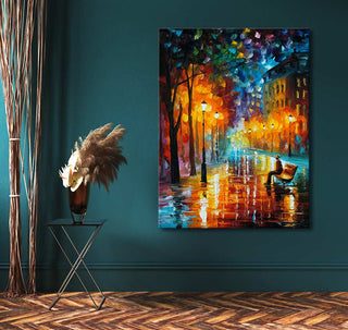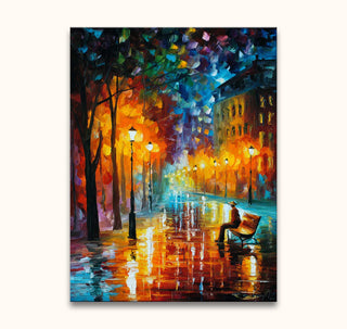Origineel handgeschilderd schilderij 'Loneliness of Autumn' in de stijl van Leonid Afremov, door Grootmeesters. Modern olieverfschilderij van hoge kwaliteit waarbij de unieke schoonheid van een regenachtig park door middel van impressionistische schilderkunst is afgebeeld. Dit is een origineel werk geïnspireerd door de stijl van Leonid Afremov, geen reproductie.