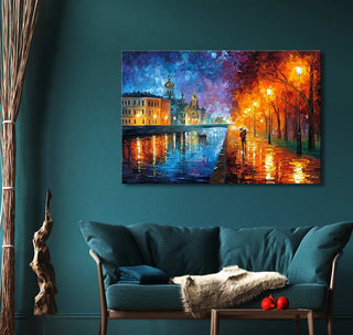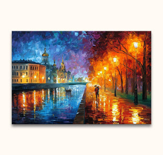 Origineel handgeschilderd schilderij 'Love from Saint Petersburg' in de stijl van Leonid Afremov, door Grootmeesters. Modern olieverfschilderij van hoge kwaliteit waarbij de unieke schoonheid van een regenachtige Sint Petersburg door middel van impressionistische schilderkunst is afgebeeld. Dit is een origineel werk geïnspireerd door de stijl van Leonid Afremov, geen reproductie.
