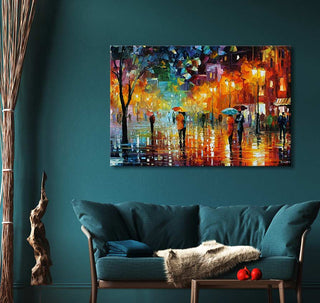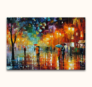 Origineel handgeschilderd schilderij 'Rainy Shopping Street' in de stijl van Leonid Afremov, door Grootmeesters. Modern olieverfschilderij van hoge kwaliteit waarbij de unieke schoonheid van een regenachtige winkelstraat door middel van impressionistische schilderkunst is afgebeeld. Dit is een origineel werk geïnspireerd door de stijl van Leonid Afremov, geen reproductie.