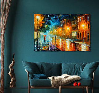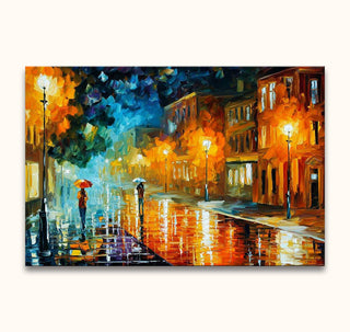 Origineel handgeschilderd schilderij 'Two Lost Souls' in de stijl van Leonid Afremov, door Grootmeesters. Modern olieverfschilderij van hoge kwaliteit waarbij de unieke schoonheid van een regenachtige straat door middel van impressionistische schilderkunst is afgebeeld. Dit is een origineel werk geïnspireerd door de stijl van Leonid Afremov, geen reproductie.