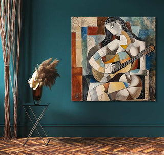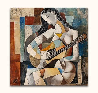 Handgeschilderd schilderij Ranucia speelt Gitaar - Pablo Picasso signature. Modern abstract olieverfschilderij van hoge kwaliteit waarbij Ranucia, een vriendin van Picasso, door middel van kubistische schilderkunst is afgebeeld.
