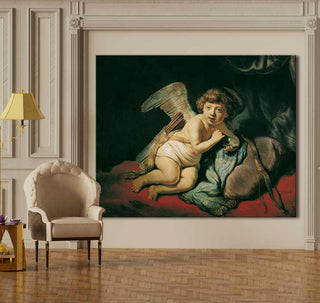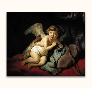Handgeschilderd olieverfschilderij Cupido van Rembrandt van Rijn. Olieverfschilderij van hoge kwaliteit waarbij Cupido door middel van klassieke schilderkunst is afgebeeld.