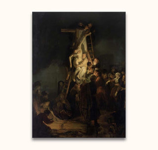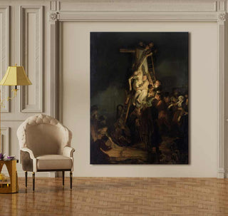 Handgeschilderd olieverfschilderij De Afdaling van het Kruis van Rembrandt van Rijn. Olieverfschilderij van hoge kwaliteit waarbij de afdaling van het kruis van Juzus door middel van klassieke schilderkunst is afgebeeld.