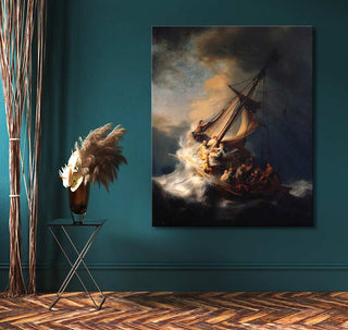Handgeschilderd olieverfschilderij De Storm op Zee van Rembrandt van Rijn. Olieverfschilderij van hoge kwaliteit waarbij een storm op zee door middel van klassieke schilderkunst is afgebeeld.