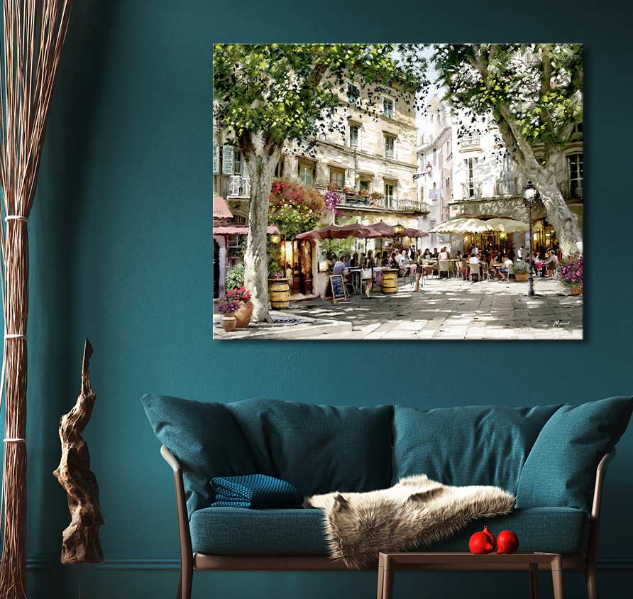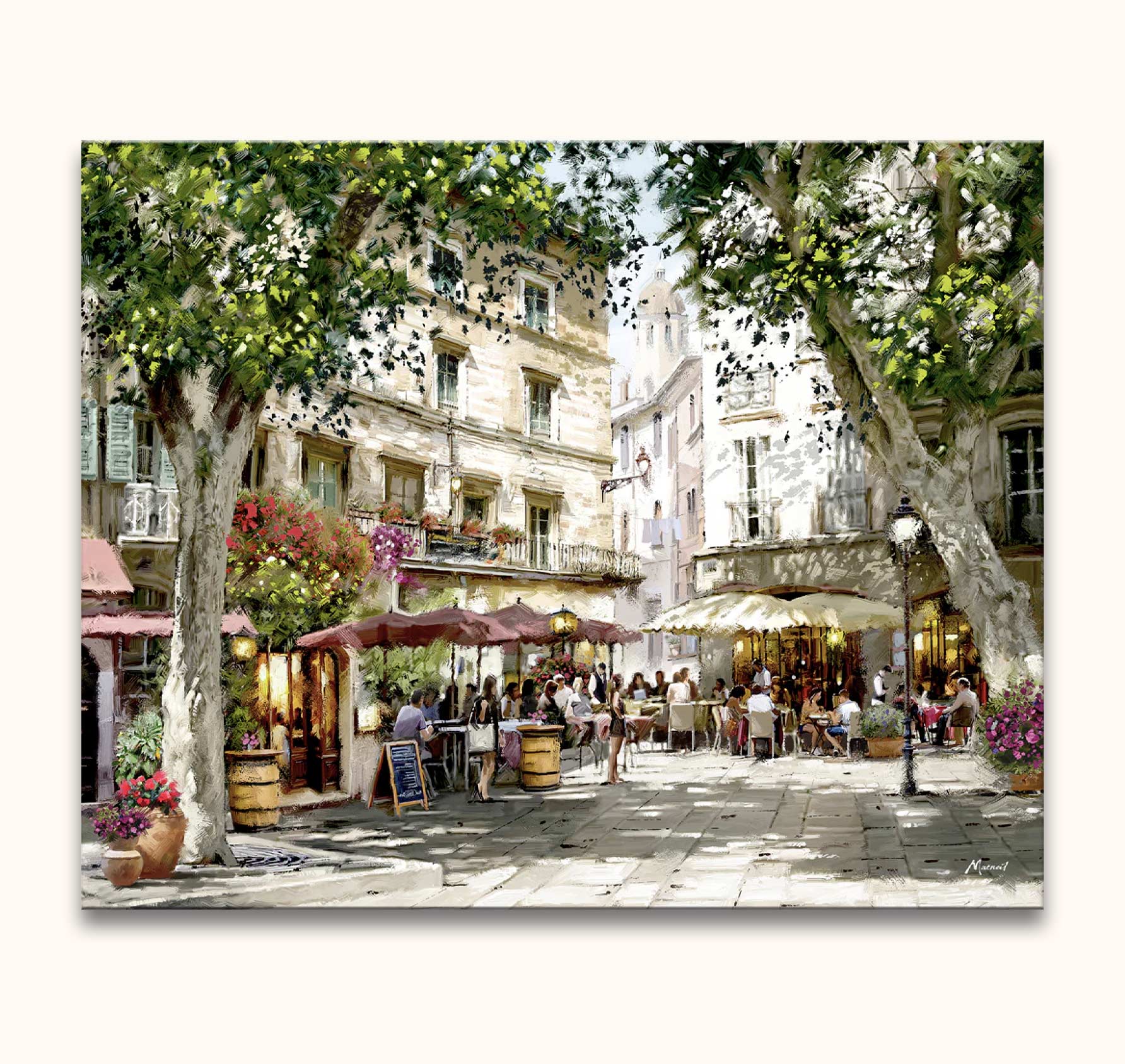 Handgeschilderd olieverfschilderij 'Plaza Cafe' van Richard MacNeil. Leg de charme van mediterrane pleintjescafés vast met het Plaza Cafe van MacNeil. Dit elegante kunstwerk geeft elke ruimte een verfijnde uitstraling en roept de ontspannen maar levendige sfeer op van zonnige buitenbijeenkomsten.