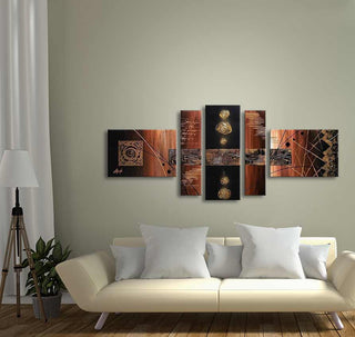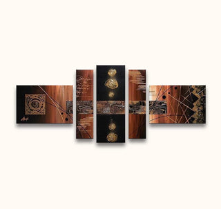 Handgeschilderd 5-Luik Schilderij Tribal Art. Olieverfschilderij van hoge kwaliteit waarbij tribale oerkunst door middel van moderne paletmes schilderkunst is afgebeeld.