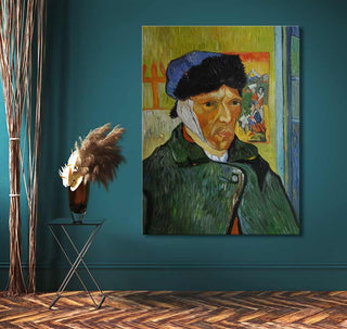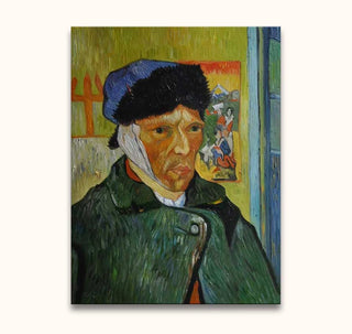 Handgeschilderd olieverfschilderij Zelfportret na Ooramputatie van Vincent van Gogh. Olieverfschilderij van hoge kwaliteit waarbij een zelfportret van Vincent, nadat hij zijn rechter oor had afgesneden, door middel van impressionistische schilderkunst is afgebeeld.